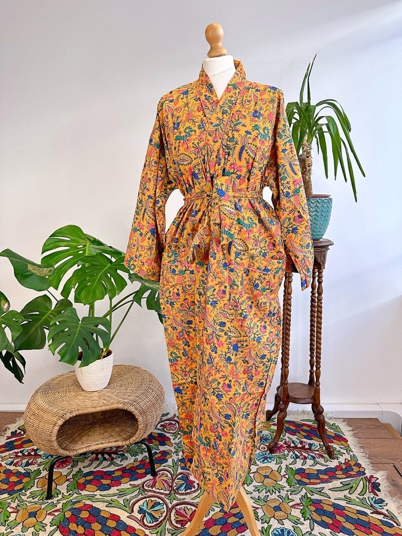 /    /  Clothing, Cotton, Her's, Kimonos/Robes  /  Pure Cotton Handprinted House Robe Summer Kimono | Floral Beach Coverup/Comfy Maternity Mom | Spring Mustard Yellow Orange Botanical Forest