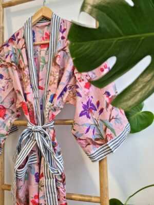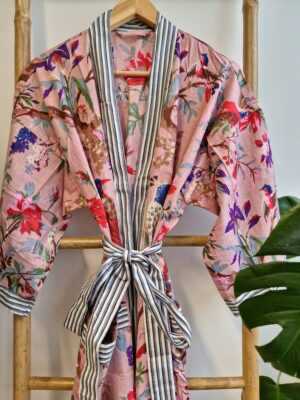 The magic of bright tropical prints with matching stripe lining flowing into House Robes/Kimonos.