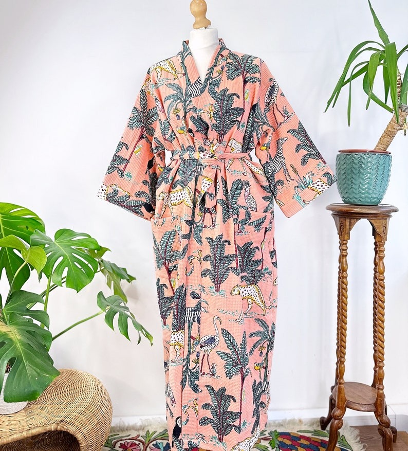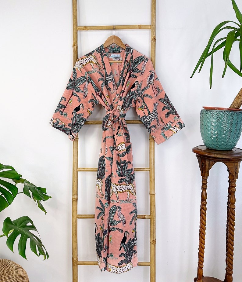 /    /  Clothing, Cotton, Her's, Kimonos/Robes  /  Pure Waffle Cotton Handprint House Bath Robe Summer Kimono | Bridal Boho Floral Spa Beach Coverup Spring Peach Jungle Safari Animal Cheetah