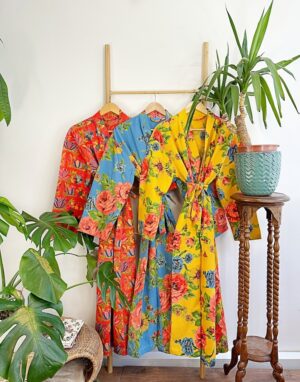 The magic of Hand prints using wooden blocks and natural dyes in small villages of Rajasthan, flowing into House Robes/Kimonos.