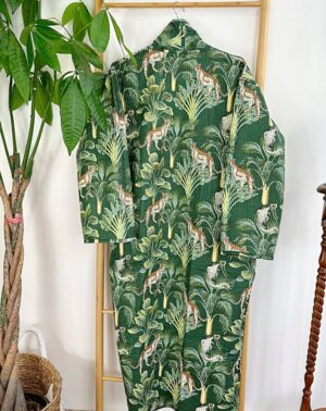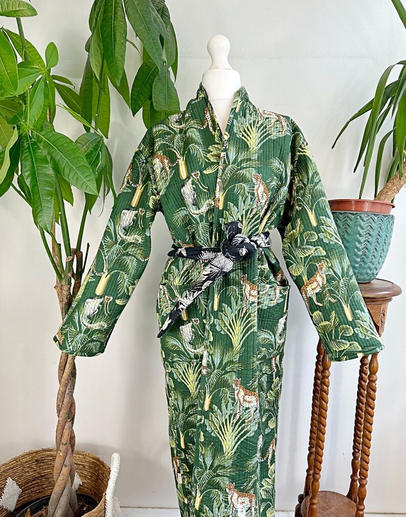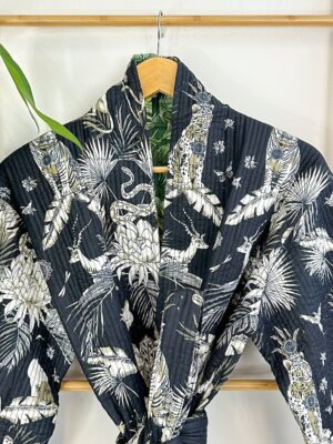 /    /  Clothing, Kimonos/Robes, Quilted Kimono  /  Quilted Unisex Cotton Reversible Long Winter Dressing Kimono Robe Boho Quirky Animal Totem Tiger Monkey Jungle Vibe Black Green Forest Lover