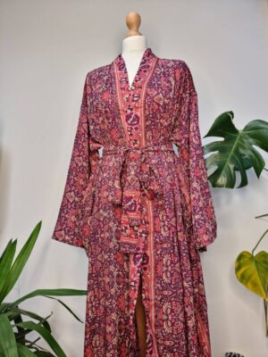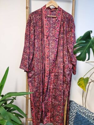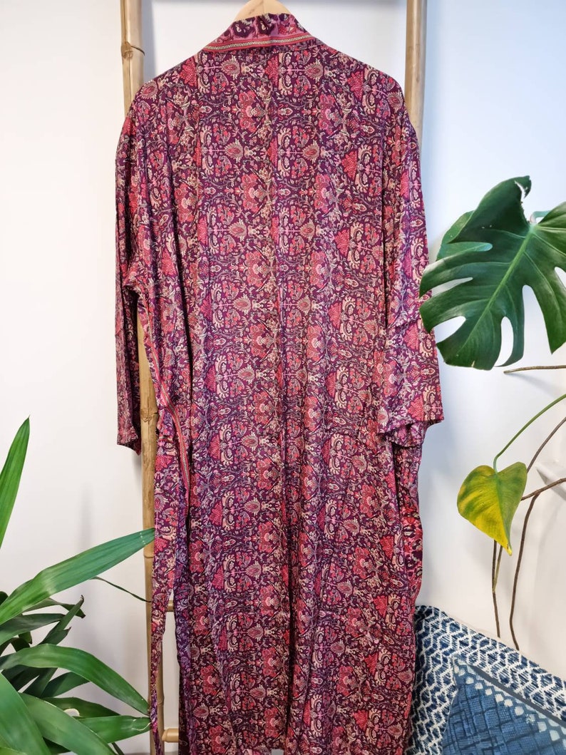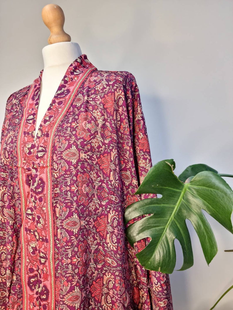/    /  Clothing, Her's, Kimonos/Robes, Silk Blend  /  New Silk Sari Boho Kimono -Persian Wine Purple Pink