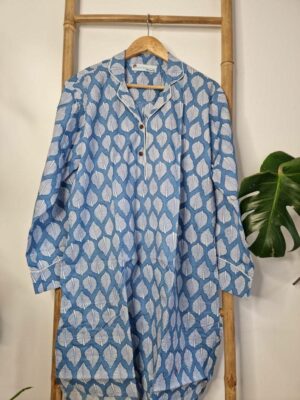 /    /  Clothing, Cotton, PJ Sets  /  Night Shirt Luxury Soft Cotton Indian Hand Block Blue White Botanical Leaves Lounge Sleepwear Nightdress Girls Pyjama Party Bridesmaid Hens