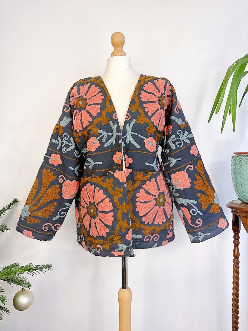 We make Vintage Suzani Jackets on request only from the fabrics we have sourced and stocked and use only when making something one of a kind .