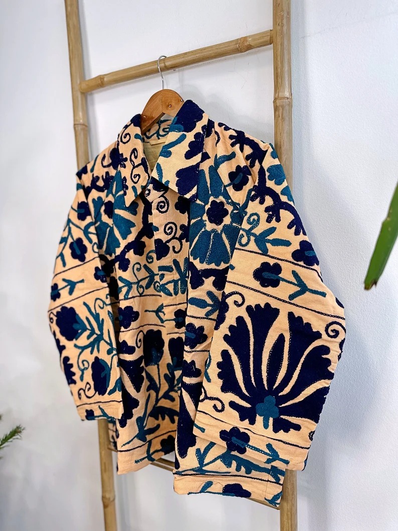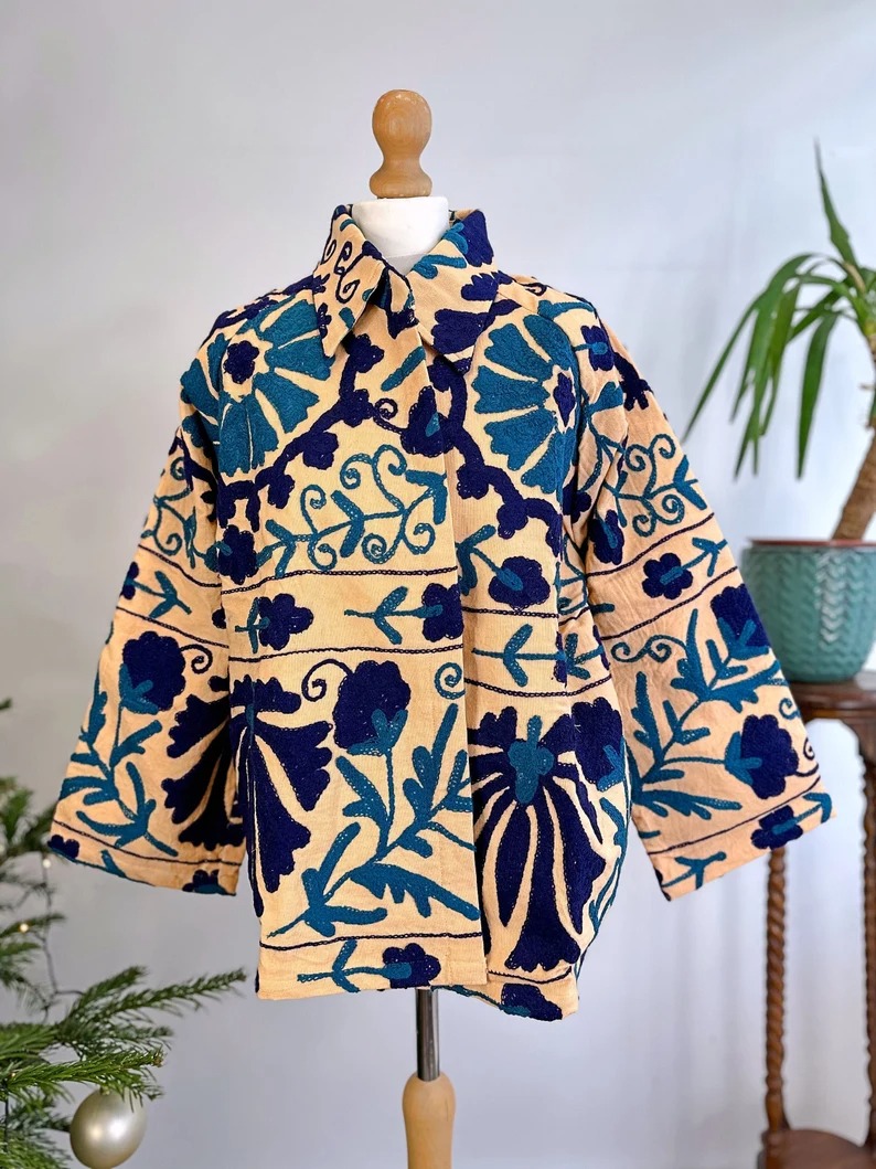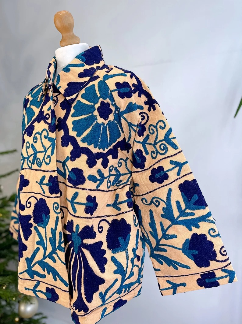 /    /  Clothing, Suzani Jacket  /  Suzani Hand Embroidered Unisex Bolero Short Jacket Spring Boho Gypsy Kashmir Crewel Special Love Gift | Quirky Cafe Beige Blue Hue Leaf