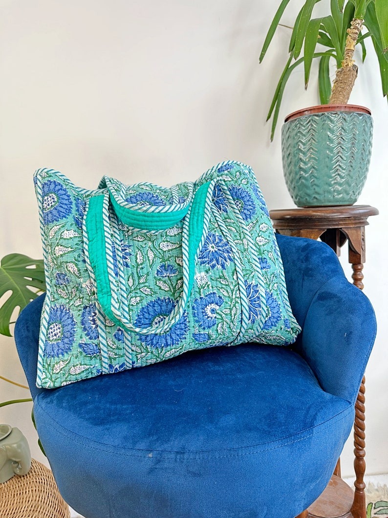 /    /  Bags, Clothing, Quilted Bags  /  Quilted Cotton Handprinted Reversible Large Tote Bag Eco friendly Sturdy Grocery Shopping Handmade Artist Boho Carry All Aqua Blue White