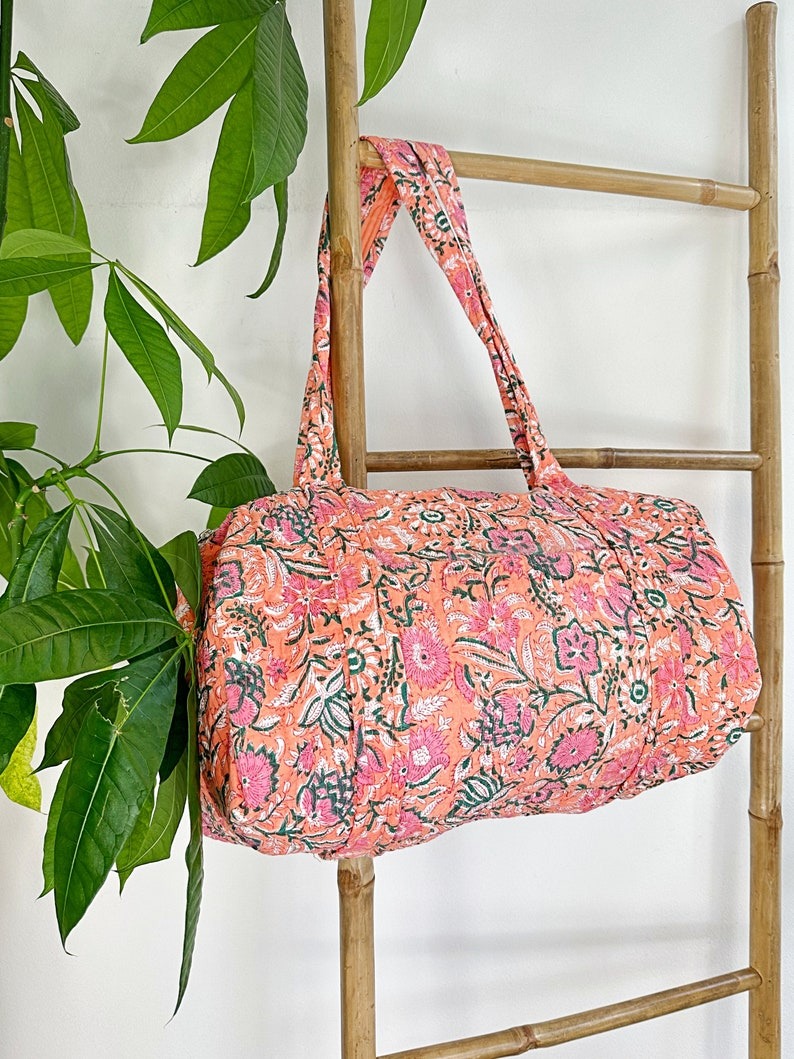 Quilted Duffle Tote Shoulder Bag Cotton Peach Orange Pink Floral Eco friendly Sustainable Sturdy Yoga Shopping Beach Artist Boho Weekender