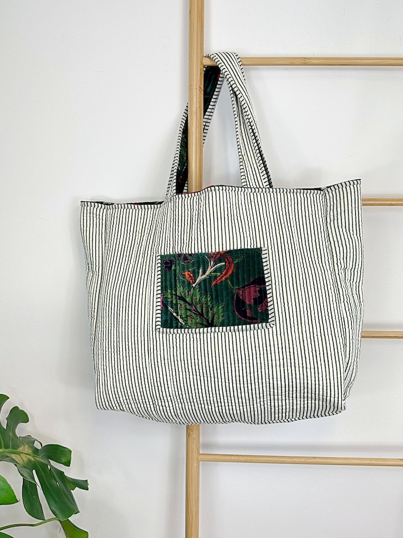 Quilted Velvet Cotton Reversible Extra Large Tote Bag Beach Weekender Eco friendly Sustainable Sturdy Grocery Shopping Emerald Green Floral